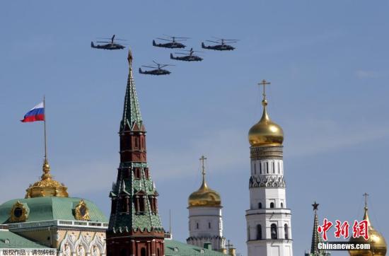 当地时间5月7日,俄罗斯军队士兵在红场准备胜利日阅兵总彩排。5月9日,莫斯科红场将举行庆祝卫国战争胜利70周年阅兵仪式。图为卡-52直升机飞过红场上空。
