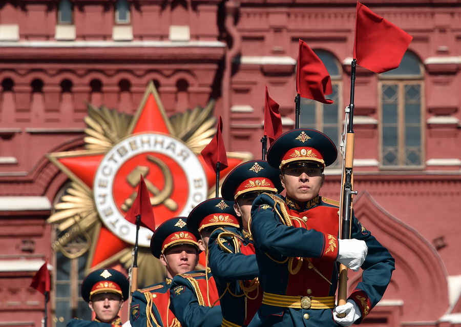 5月7日,在俄罗斯首都莫斯科红场,俄罗斯军人参加阅兵彩排。新华社/法新