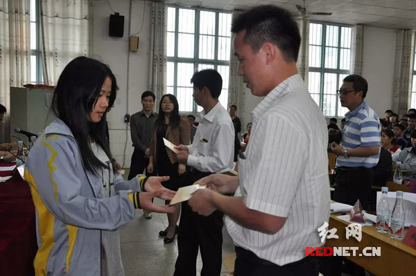 红网武冈5月9日讯(通讯员 关杨博) “我会珍惜这个大好机会,绝不辜负各位叔叔阿姨的期望,在学校里做个优秀学生,将来用爱心回报社会。”5月8日,在现场接受九三学社爱心人士捐款后,心怀感激的武冈一中高三学生欧元春说出了30名受助孩子的心里话。