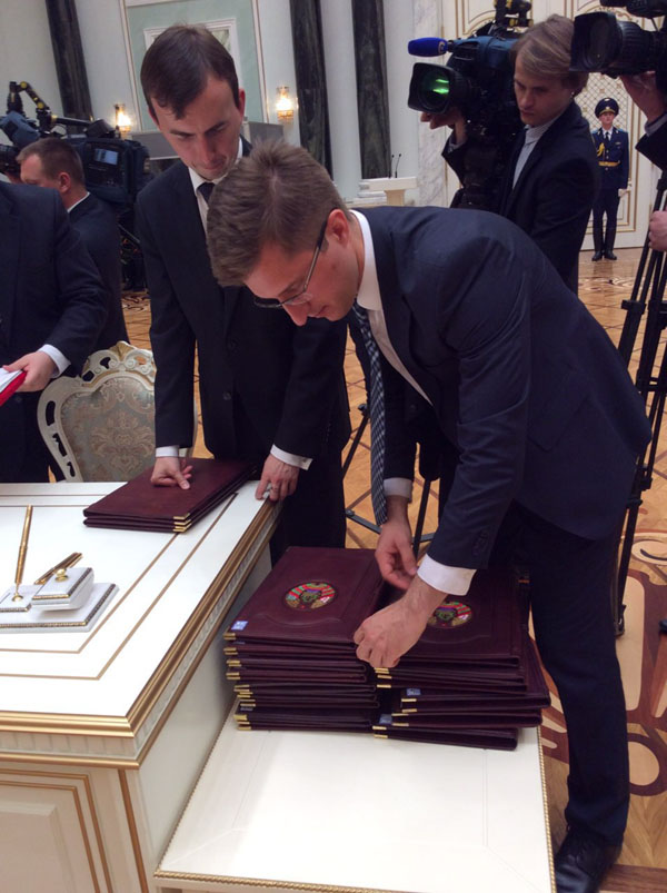 10日傍晚,在习主席和卢卡申科总统见证下,独立宫授勋厅内举行了中白双边合作文件签字仪式。双方要签的两大摞合作协议文本摆放在桌旁的茶几上。桌子后面站着20多位中白双方签约人——中方的省部级官员、银行老总和相应的白方官员分列两队。