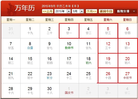 放假安排是这样的:①9月3日—5日为纪念中国人民抗日战争暨世界反法西斯战争胜利70周年放假;②12日、13日周末;③19日、20日周末;④26日、27日中秋假期。