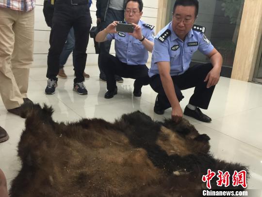 图为森林公安民警展示查获的大熊猫皮 马骞 摄