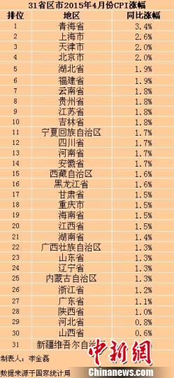 在这31个省份中,青海4月份CPI同比涨幅最高,为3.4%,也是全国仅有的CPI涨幅在“3”时代的地区。新疆涨幅最低,仅为0.2%。