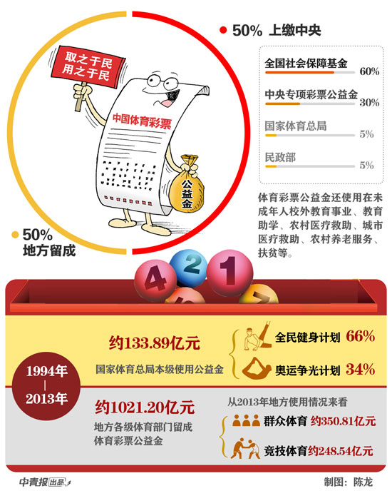《报告》说,中国体育彩票公益金被主要用于社会公益事业和体育事业的发展,体育彩票作为“公益事业助推器”和“体育事业生命线”的作用明显。根据《报告》的统计,1994至2013年,中国体育彩票累计销售约7017亿元,筹集体育彩票公益金约2030亿元,其中近一半上缴中央财政,被用于包括补充社?;鹪谀诘亩嘞钌缁峁婧透@乱担远嘤谝话氲墓娼鹆粼诘胤?,主要用于体育事业。