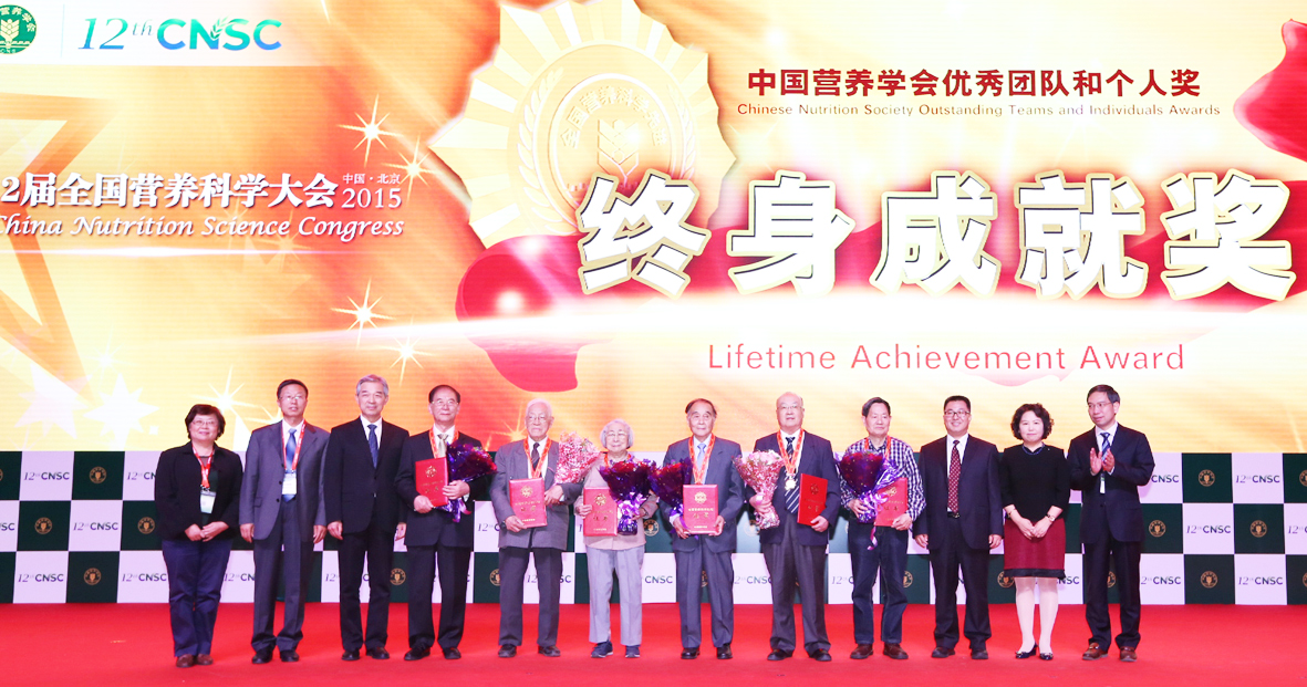 王陇德院士(左三)、杨月欣理事长(右二)为老一代营养学家颁发终身成就奖,并与专家们合影 摄影 李木元