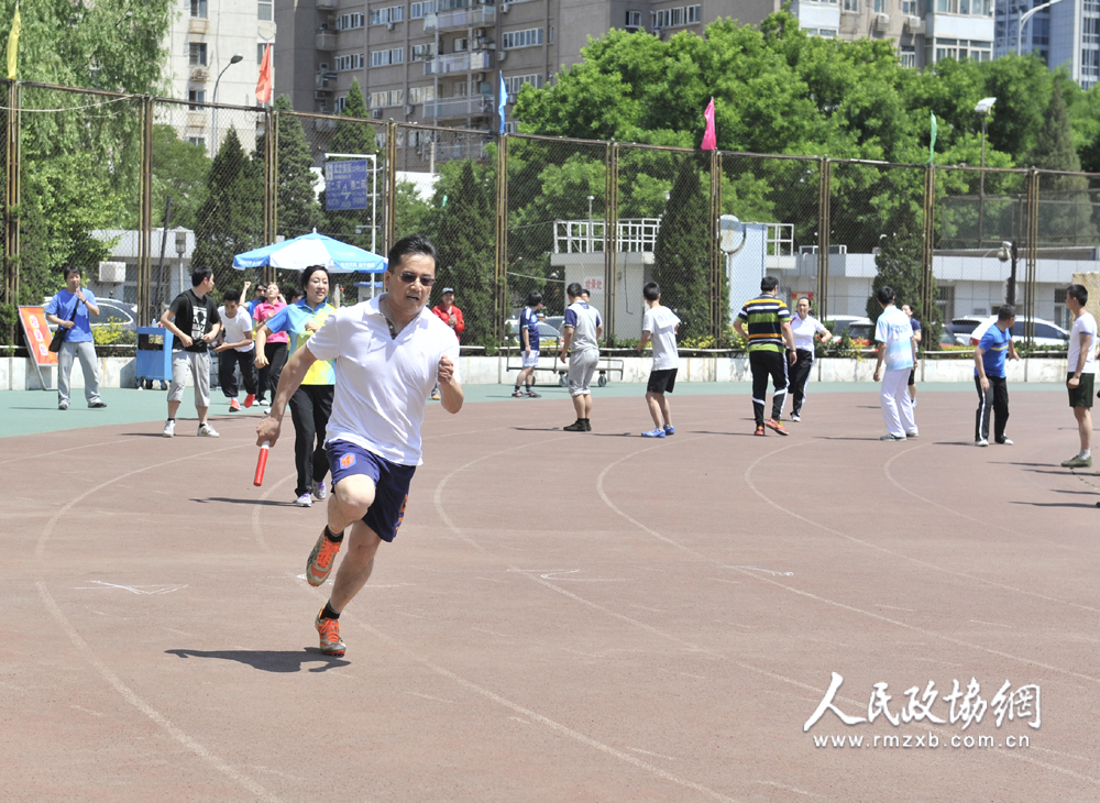 5月20日上午,全国政协机关第九届职工运动会在北京月坛体育场开幕。图为团体4*100米接力比赛进行中。人民政协网记者 姜贵东摄