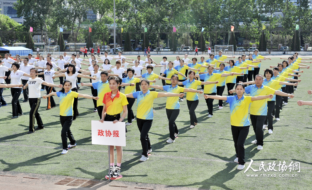 5月20日上午,全国政协机关第九届职工运动会在北京月坛体育场开幕。图为广播操表演。人民政协网记者 姜贵东摄