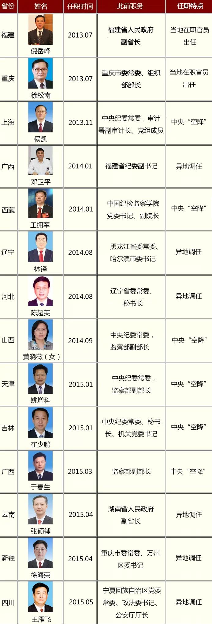 原标题:十八大以来13省份换纪委书记 6人"空降"6人异地调入