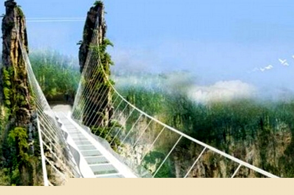 张家界大峡谷玻璃桥位于湖南省的张家界大峡谷景区内,桥面全部采用透明玻璃铺设,桥中心有全球最高的蹦极台,整个工程无钢筋支架,是一种全玻璃结构的桥梁。