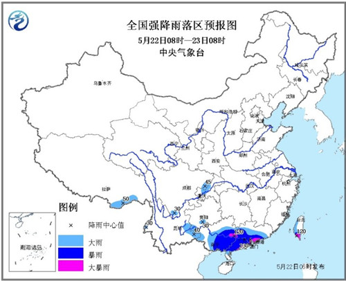 5月22日08时至23日08时,新疆北部、青藏高原东部、西南地区、华南等地有小到中雨或阵雨,其中,西藏东南部、重庆西部、云南东南部、贵州南部、广西中南部、广东中南部、台湾南部等地的部分地区有大到暴雨,广西东部、广东中部沿海等地的局地有大暴雨;上述部分地区还将伴有短时强降水等强对流天气。东海、台湾移动洋面有6~8级、阵风9级的旋转风,东海南部海域将有6~8级、阵风9级风。