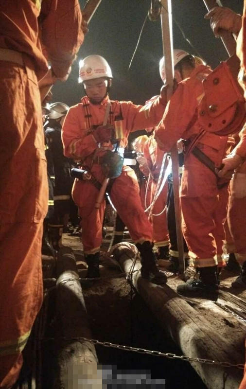 钻井机作业停止,消防战士已下井展开营救。(新打的井井口直径约80厘米,只能供一名战士下井救援)