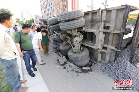 5月20日下午15时许,郑州市秦岭路与北三环交叉口向南500米处,一辆满载建筑材料的渣土车途径此处路面突然塌陷造成车辆侧翻,车上的建筑沙石倾倒将路边电力工业学校的围墙砸塌十多米,所幸当时围墙里面的操场上并无学生。 杨正华 摄