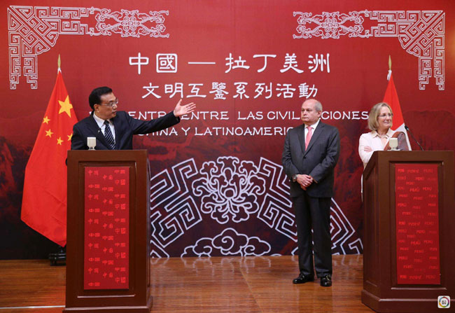 李克强总理在“中拉文明互鉴酒会”上致辞。秘鲁文化部长阿尔瓦雷斯女士在此前的致辞中说,秘鲁人一直把中国人看作是“老乡”