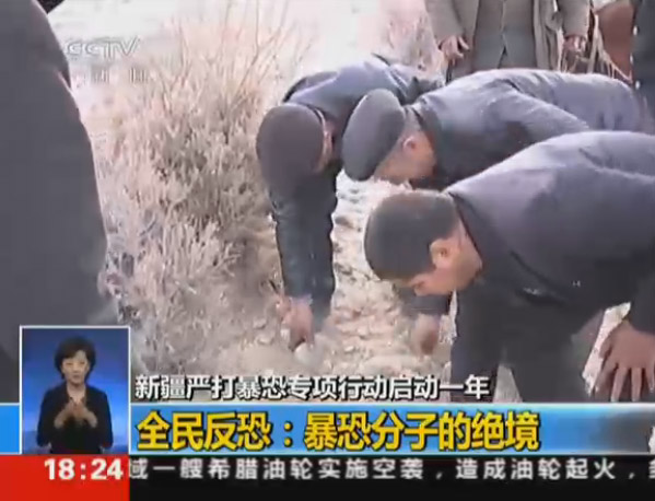 图为央视新闻截屏画面,新疆警察和民众一同搜山抓暴恐分子。