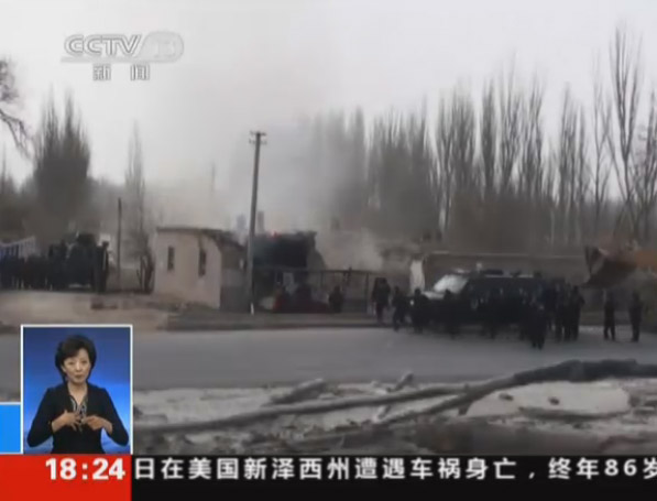 图为央视新闻截屏画面,新疆警察和民众一同搜山抓暴恐分子。