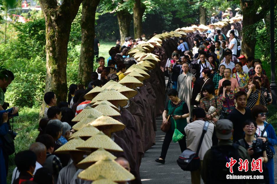 5月25日,农历四月初八,为纪念佛祖释迦牟尼诞辰日,杭州市各大寺院及杭州佛学院的630名僧人共同参加“东南佛国·托钵行脚”慈善募捐活动。僧人们统一头戴竹笠、身披衲衣、手托钵盂、脚踏芒鞋,从上天竺法喜讲寺列队出发,沿天竺路,途经中天竺法净禅寺、三天竺法镜讲寺至灵隐禅寺大雄宝殿前举行“云林茶礼”和“祈祷世界和平法会”,一路托钵行脚,沿途接纳信众捐款布施,所得46.8万元捐款全部捐赠给浙江省慈善总会。这是杭州佛教界连续第七年举行“托钵行脚”慈善募捐活动,本次活动也拉开了浙江省宗教界“寻梦中国·正言正行”系列文化活动的帷幕。中新社发 李忠 摄 图片来源:CNSPHOTO