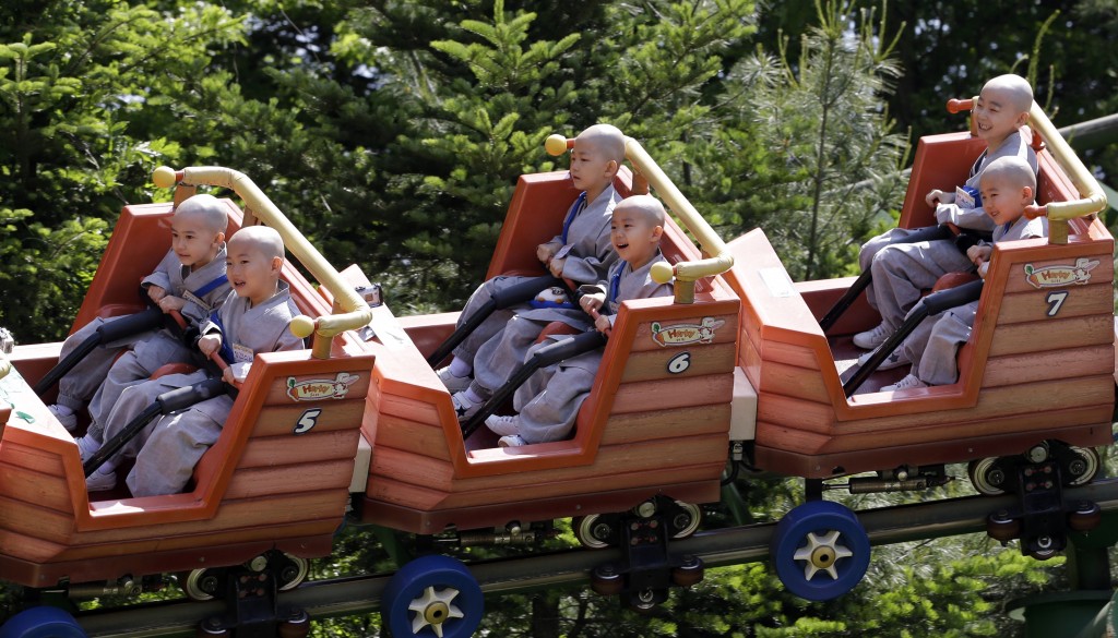 5月21日,这些剃光头的儿童在参观爱宝乐园期间小憩。这些儿童在一家寺庙内用数周的时间体验僧侣的生活,以便参加定于5月25日举行的佛祖第2559个诞辰纪念活动。