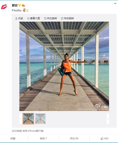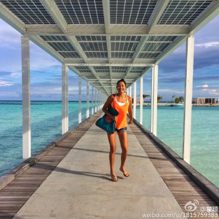 中新网5月26日电 今日,瞿颖在微博晒出在马尔代夫度假照片,她身穿橘黄色吊带和蓝色牛仔短裤,大秀修长美腿。此外,她还站在海上走廊,踮起脚尖,做出惊讶的表情,画面十分搞笑。