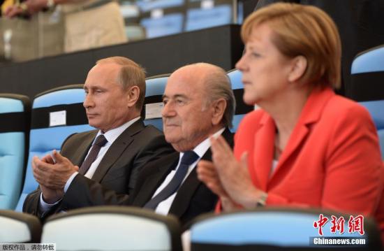 资料图:国际足联主席布拉特与德国总理默克尔、俄罗斯总统普京一同观看2014年巴西世界杯决赛。