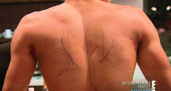 杰德利卡准备接受整形手术,背部已经标记好切割线(网页截图)