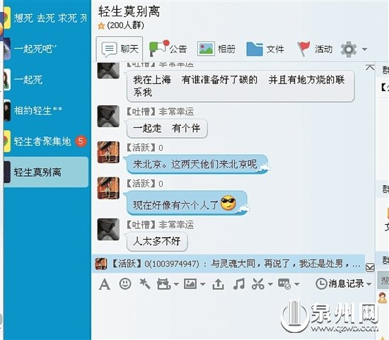 跳楼、吃安眠药、烧炭、跳海、割腕、水银、氰化钾……在这些网友的聊天中,结束生命的方式被随意地化成聊天字眼映入眼帘。前不久两名年轻女孩在泉州市区泉秀街一家酒店烧炭自杀也成为他们关注的“例子”。网友“非常幸运”说:“前两天泉州有两个女的一起烧炭了,死了。”其他网友有的附和说“烧炭不错”,有的则称“有没有新鲜花样”。聊到激动处时,有网友播发语音聊天,一边唱歌,一边哭啕。