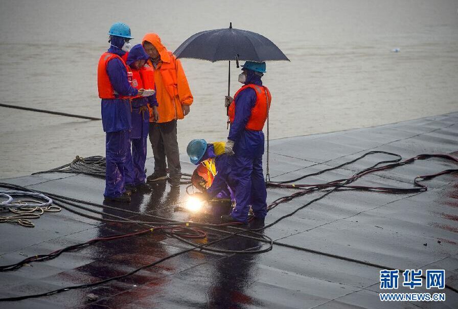 目前,救援人员已在翻沉的“东方之星”船底打开了两个探孔,但均未发现生命迹象。救援人员又迅速将这两个探孔封上。在现场指挥救援的中国船级社武汉分社总经理王志刚介绍,开孔是探测生命的最后一招。按照国际惯例,把72小时作为生命的标准线,在此之前要千方百计确定有无生命;如果72小时到了,确定没有生命,再把船翻过来,这是对生命的尊重。新华社记者肖艺九摄