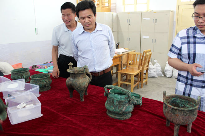 王二虎副主委(左二)考察周原博物馆最新出土青铜器文物。