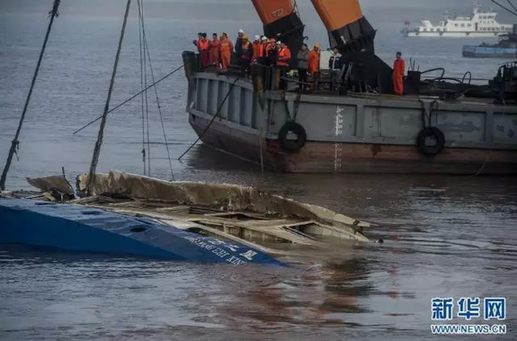 ?。?月5日8时30分左右,“东方之星”沉船正在被扶正,已露出顶部及四层和三层。新华社记者 肖艺九 摄)
