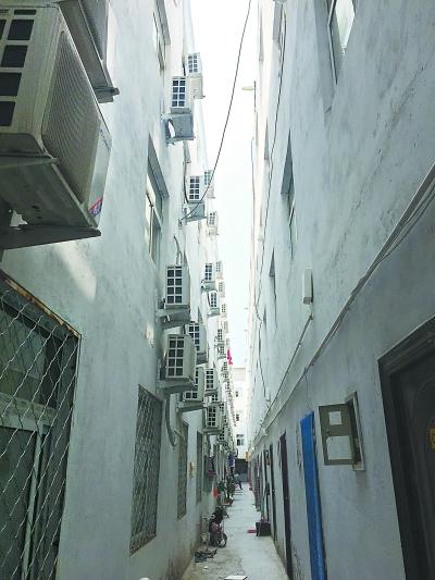 最靠大院里边的“绿英岛公寓”,一层简易的彩钢板当了楼顶,楼道几乎漆黑一片,一层一些房间的门框上方挂着空调外挂机。“靠北边的房子连窗户都没有,空调外挂机只能装楼道里”,一位刚回来的租户说着打开房门请记者参观。不足十平方米的屋里有卧室、厨房,还有卫生间。为了一家三口住着方便,单人床与上下铺拼在一起,下面睡觉,上面储物。不足两平方米的卫生间里,淋浴就安在蹲便器斜上方,墙上地上污迹斑斑。租户说,“在这住什么都没法讲究了,人们白天在附近公司上班,是白领;晚上回到这里,住在黑漆漆的小房子里,甚至连说话都得小声,因为隔壁屋手机振动都能听到。”