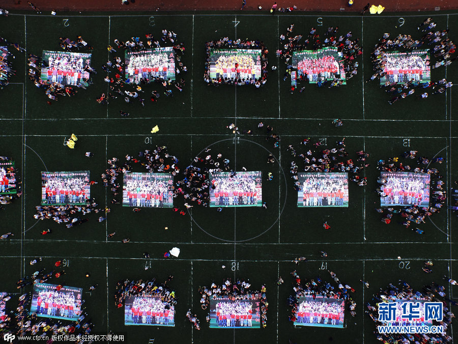 2015年6月8日,重庆市杨家坪中学,千余名2015年高考毕业生,在结束最后科目的考试后,汇聚在操场上摆放班级毕业合影照,以此来结束自己的中学时代。
