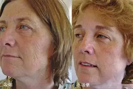 左边的烟民眉毛稀疏,鱼尾纹,脸纹明显比右边多得多。并且脸部下垂,面部略浮肿。