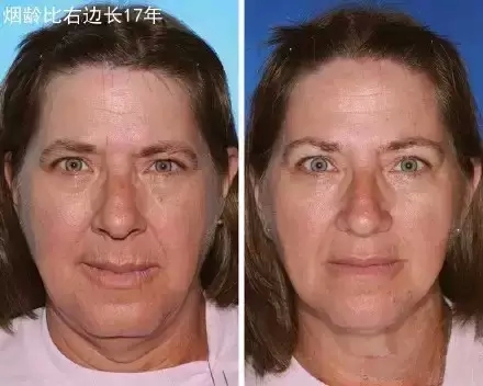 这两位都吸烟,左边比右边烟龄长17年。最明显的差异是左边这位的嘴巴,颜色灰白,布满褶皱。此外,眼袋、下巴也更松弛。