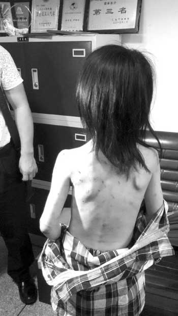 这两个小孩就是小强和小琳??吹剿?,记者简直不敢相信自己的眼睛:眼前两个瘦骨嶙峋人儿怎么看都不像13岁和15岁!从神情上看,他们低沉木讷,完全没有少年儿童的天真浪漫,而从身体发育上看,却只有二三年级小学生的个子。尤其是小琳,面黄肌瘦、身高不足130厘米,体重才26.5公斤,明显发育不良。更令人揪心的是,两个孩子遍体鳞伤,浑身都是斑斑点点的淤青和伤痕,从手到脚、前胸后背、大腿、腹部几乎找不到一块好皮肤。小琳的右脸颊还有一大片延至眼窝的淤青,左脸颊下侧和两条手臂则是横七竖八的血痕和血痂,惨不忍睹。