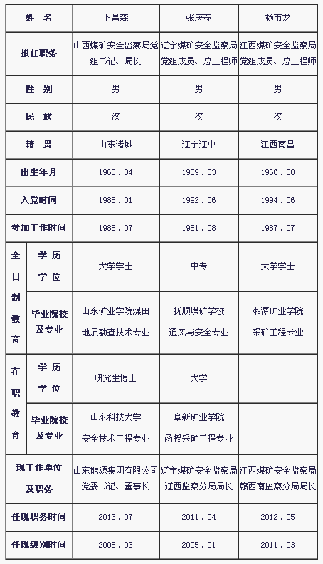 原标题:国家安监总局发布卜昌森等3名干部任前公示(简历)