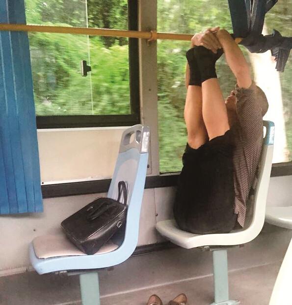 男子公交上脱鞋练瑜伽 一路从武昌练到汉口(图)