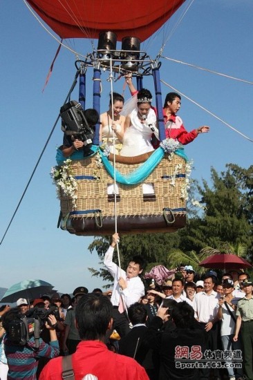 杨云乘坐热气球从空中缓缓驶来。在即将落到婚礼现场的时候,热气球上忽然甩下一条绳子,杨威就脱掉身上的西服,三下五除二地徒手爬了上去