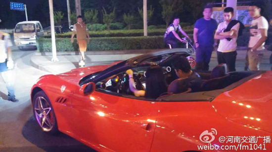 6月12日晚上,在郑州交警CBD夜查飙车行动中,一女子携带一男驾红色法拉利跑车在商务内环超速行驶。被交警拦下后,车上男子下车抢夺河南交通广播记者的采访机,并造成记者受伤。
