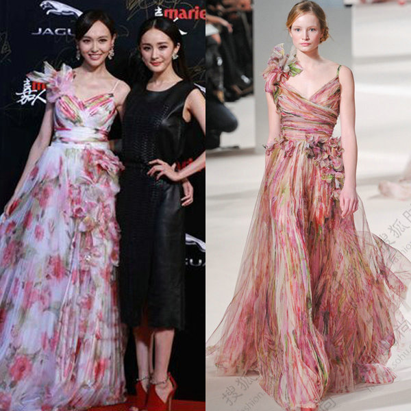 之后,唐嫣早年参加某活动的另一造型也被网友指出为山寨版本。这条飘逸的印花雪纺裙和右边的Elie Saab在款式上极其相似,但是不管是花色还是材质都有明显不同。据网友挖出,这条礼服出自一家名为“QUEENS PALACE”的婚纱礼服馆。而唐嫣之前在出席2013偶像盛典时那条曾被误认为Tony Ward高级定制礼服,其实也是出自这家婚纱馆。