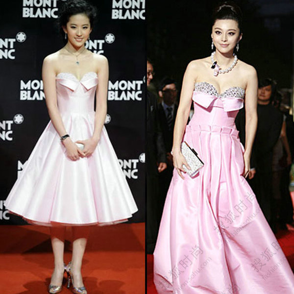最著名的山寨礼服事件发生在刘亦菲身上,当年她一袭粉色露肩礼服被指出山寨右图范冰冰那条Valentino高级定制后,便一发不可收拾,被网友挖出多套出席红毯和参加活动时的礼服为山寨版本,其中包括Fendi、Dior和LV。而为刘亦菲设计这些山寨礼服樊其辉于2010年自杀,让人唏嘘。不过如今的刘亦菲已经得到了各大品牌的认可,并穿过了包括Georges Hobeika和Tony Ward高级定制礼服。
