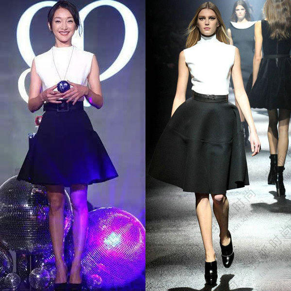 周迅也曾被“山寨”礼服坑过!当年在台湾出席某品牌活动时她身穿的这条黑白色裙装被指出山寨自Lanvin 2012秋冬。仔细对比后可以发现,不管是高领的改动,还是从伞裙变成A字裙,周迅的版本跟T台上都有很大的不同。