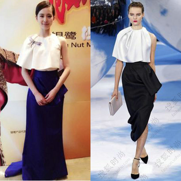 2014年4月,刘诗诗以代言人身份出席某品牌发布会。这条白色撞色礼服在当时被指出“山寨”自Dior 2013秋冬系列,而原版之前赵薇曾穿过。不过之后有消息澄清,刘诗诗这个look上半身出自Dior,下半身长裙为国内高级定制品牌MICIHLA DONNA。