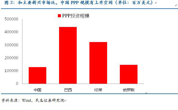 PPP模式具有较大的发展潜力。一方面,2013年中国PPP项目的累计总投资为1278亿美元,和同类型新兴市场比有较大的差距。另一方面,2013年新增的PPP投资额仅为7亿美元,而2013年城投债的发行量则高达9512亿元,若PPP模式成功替代城投主导的融资模式,其发展空间巨大。