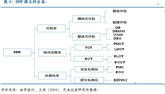 从广义上来说,PPP指的是企业参与提供传统上由政府独自提供的公共产品或服务的模式。从世界银行对PPP的分类来看,主要包括外包类、特许经营类和私有化类。因此,BOT本质上也可视为是PPP的一种。