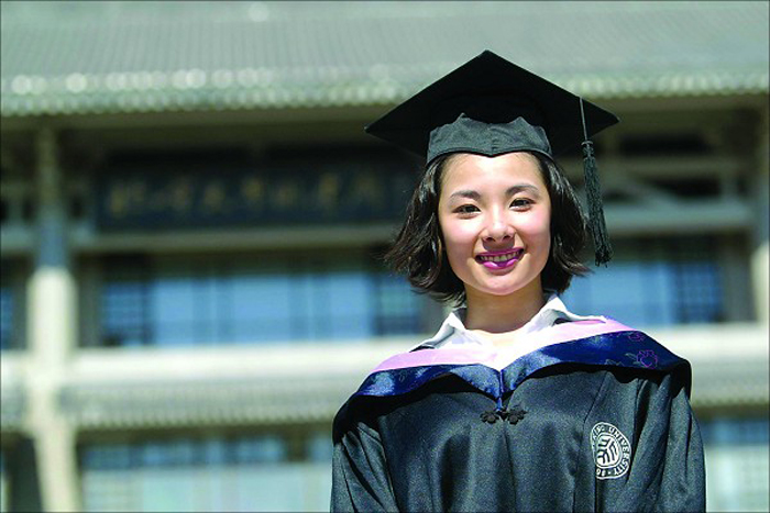 2005年7月5日,著名体操运动员刘璇从北京大学新闻学专业本科毕业,获得学士学位。图为身着学士服的刘璇在北大图书馆前留影。