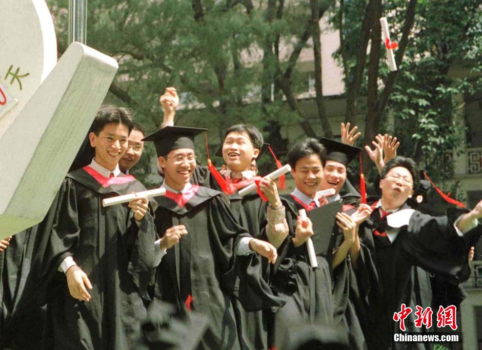 直到1994年,国务院学位委员会审定通过了新中国自己的学位服样式,并作出决定:作为统一规范的学位服,向全国学位授予单位推荐使用,其他样式的学位服一律废止。图为90年代广东工业大学今年应届毕业的大学生身着学士服在校园留影。中新社发 陈文 摄