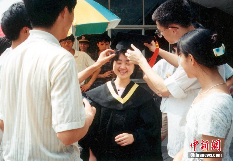 当学士服正式华丽进入中国大学生的毕业季时,地位举足轻重,很多学生郑重的在毕业时穿着“大袍子”举着用红丝带系起来的毕业证书,仪式感很强。图为90年代初北京的大学毕业生时兴穿毕业服留影纪念,这位雅气未脱的女大学生,在同学们帮助下披上学士服时,感到美好难忘。中新社发 张勤 摄