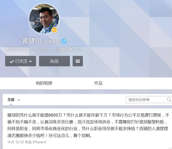 黄健翔在微博中写道,“踢球的凭什么就不能值6600万?凭什么就不能年薪千万?市场行为公平交易愿打愿挨,不偷不抢不骗不贪,认真训练辛苦比赛,流汗流血场场拼命,不靠整容打针玻尿酸塑料脸,同样是职业,同样市场化商业化的行业,凭什么职业球员就不能多挣钱?质疑的人请搜搜演艺圈都挣多少钱吧!孙可这点儿,算个屁啊。”