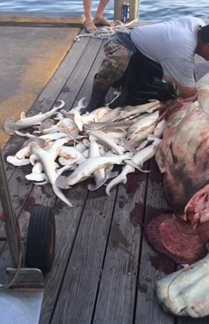 在视频中,可以听到有其他路人在场,其中一个女人在边上数着被取出来的小鲨鱼数量,最后数完一共34只?;固接行┤嗽谑悠道镄ψ?,另外有个女人在抱怨味道太重。