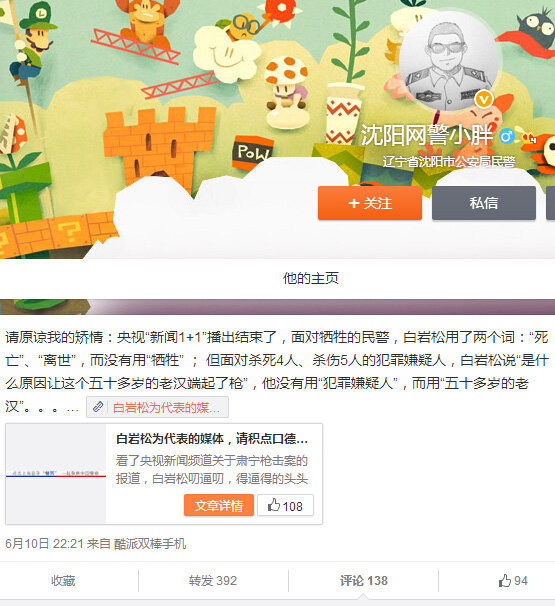 最为不满的是认证为辽宁省沈阳市公安局民警的@沈阳网警小胖。他10日晚间发微博称,请原谅我的矫情:央视“新闻1+1”播出结束了,面对牺牲的民警,白岩松用了两个词:“死亡”、“离世”,而没有用“牺牲” ;但面对杀死4人、杀伤5人的犯罪嫌疑人,白岩松说“是什么原因让这个五十多岁的老汉端起了枪”,他没有用“犯罪嫌疑人”,而用“五十多岁的老汉”。