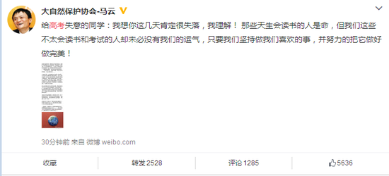 半小时不到,这封给高考失意同学的信就得到了近三千的转发和五千多点赞(马云微博截图)